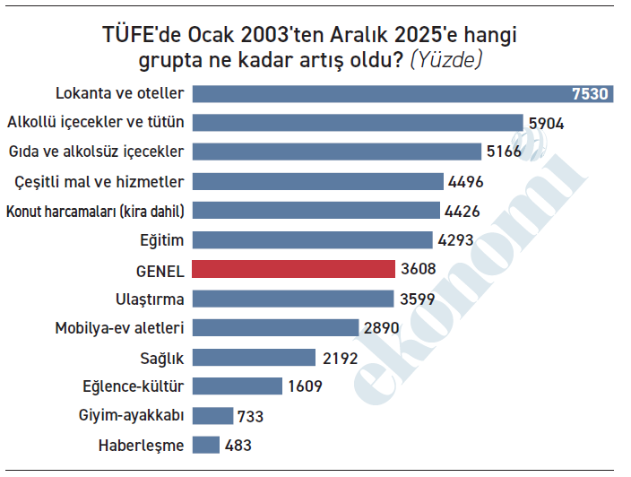 Yanıt grafikte! Bir anlamda veda ettiğimiz TÜFE’de yirmi üç yılda en hızlı fiyat artışı bakın hangi grupta yaşanmış; lokanta ve oteller grubunda. Yirmi üç yıldaki fiyat artışı tam yüzde 7530, yani bu grupta fiyatlar tam 75 kat artmış. 2003’ün ocak ayında 1 lira olan fiyat 76'ya çıkmış, 1 liradan 76’ya!