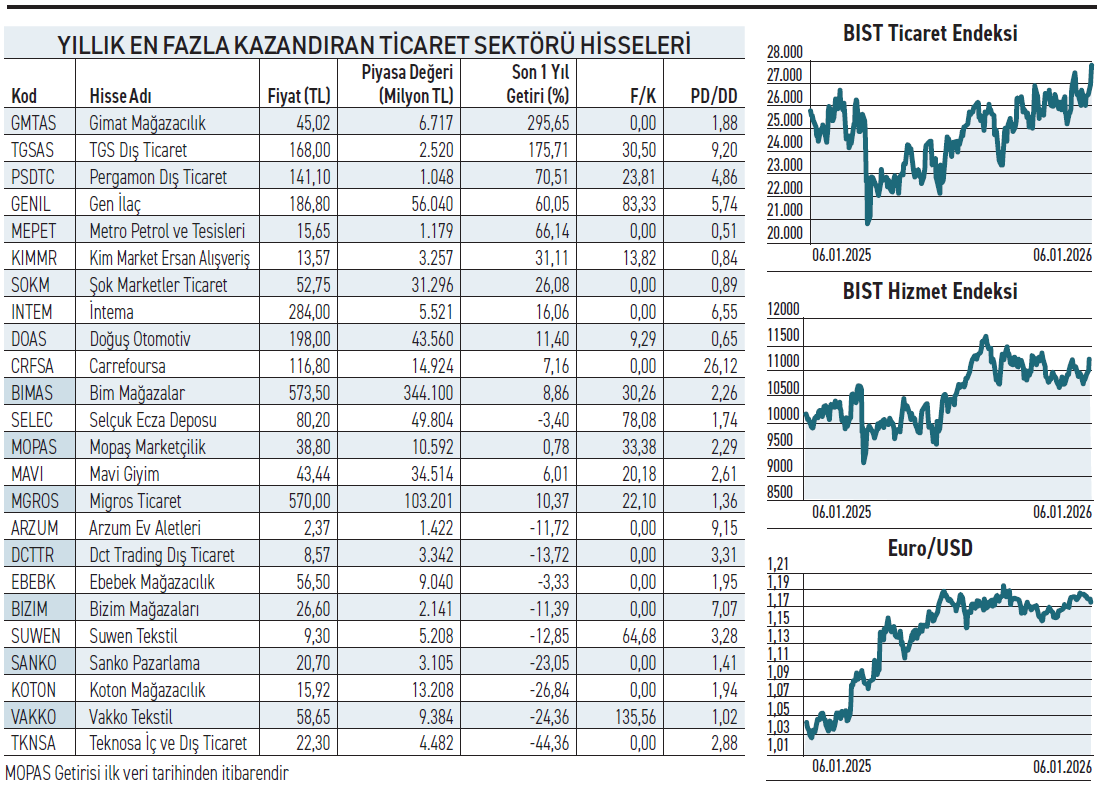 **BIST Ticaret Endeksi son bir yılda %7,8 yükselişle oldukça zayıf bir performans sergiledi. Sektörün durağan seyrine rağmen fonların ilgisiyle GMTAS %295 ve TGSAS %175 artışla en fazla yükselenler oldu.