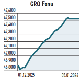 Garanti Portföy tarafından yönetilen Otuzuncu Serbest (Döviz) Fon (GRO), kademeli büyüyen bir yapıya sahip. Yılın ilk haftası 186,3 milyar TL büyüklüğe ulaştı. Portföyün %68,03’ü özel sektör dış borçlanma araçlarından, %13,58’i ters repodan, %8,26’sı döviz mevduatından oluşuyor. Aralıkta nakit çıkışı yaşanırken ocak ayının ilk haftası 3,9 milyar TL nakit girişi gözlendi.