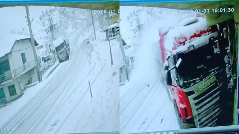 Tokat'ta sürücüsünün direksiyon hakimiyetini kaybettiği TIR, kontrolden çıkarak bir eve çarptı. Kaza anı güvenlik kamerasına yansıdı.