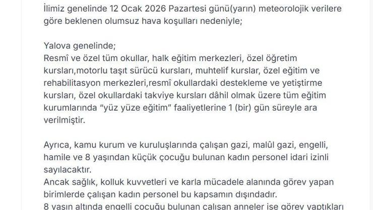 Yalova Valiliği meteorolojik verilere göre beklenen olumsuz hava koşulları nedeniyle eğitim ve öğretime bir gün süreyle ara verildiğini açıkladı. Yalova Valisi Hülya Kaya, sanal medya hesabından yaptığı paylaşımda, "Yalova genelinde; resmi ve özel tüm okullar, halk eğitim merkezleri, özel öğretim kursları, motorlu taşıt sürücü kursları, muhtelif kurslar, özel eğitim ve rehabilitasyon merkezleri, resmi okullardaki destekleme ve yetiştirme kursları, özel okullardaki takviye kursları dahil olmak üzere tüm eğitim kurumlarında yüz yüze eğitim faaliyetlerine 1 gün süreyle ara verilmiştir. Ayrıca, kamu kurum ve kuruluşlarında çalışan gazi, malül gazi, engelli, hamile ve 8 yaşından küçük çocuğu bulunan kadın personel idari izinli sayılacaktır. Ancak sağlık, kolluk kuvvetleri ve karla mücadele alanında görev yapan birimlerde çalışan kadın personel bu kapsamın dışındadır. 8 yaşın altında engelli çocuğu bulunan çalışan anneler ise görev yaptıkları birim fark etmeksizin idari izinli sayılacaktır. Tüm vatandaşlarımızdan, olumsuz hava koşullarına karşı dikkatli ve tedbirli olmalarını rica ediyorum” ifadeleri kullanıldı. (DHA)