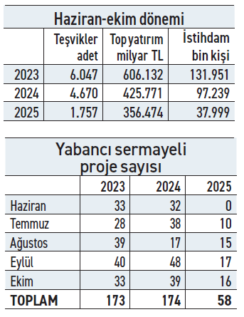 Teşvik belgeli yatırım projelerinin 5 aylık uygulama dönemlerine ilişkin sonuçlar son 3 yılda haziran-ekim dönemleri itibariyle teşvik belgesine bağlanan yatırım projelerinin toplam tutarlarının 22 milyar dolardan 2024’te 12, 7 milyar dolara, 2025’te ise 8,7 milyar dolara düştüğünü ortaya koydu.