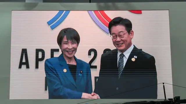 圖像加註文字,李在明在APEC峰會期間會見日本首相高市早苗。